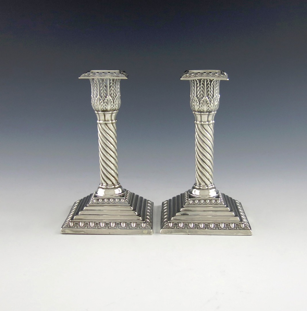 the stems with spiral decoration, acanthus capitals, on square stepped bases with acanthus borders, height 14.5cm. (2)