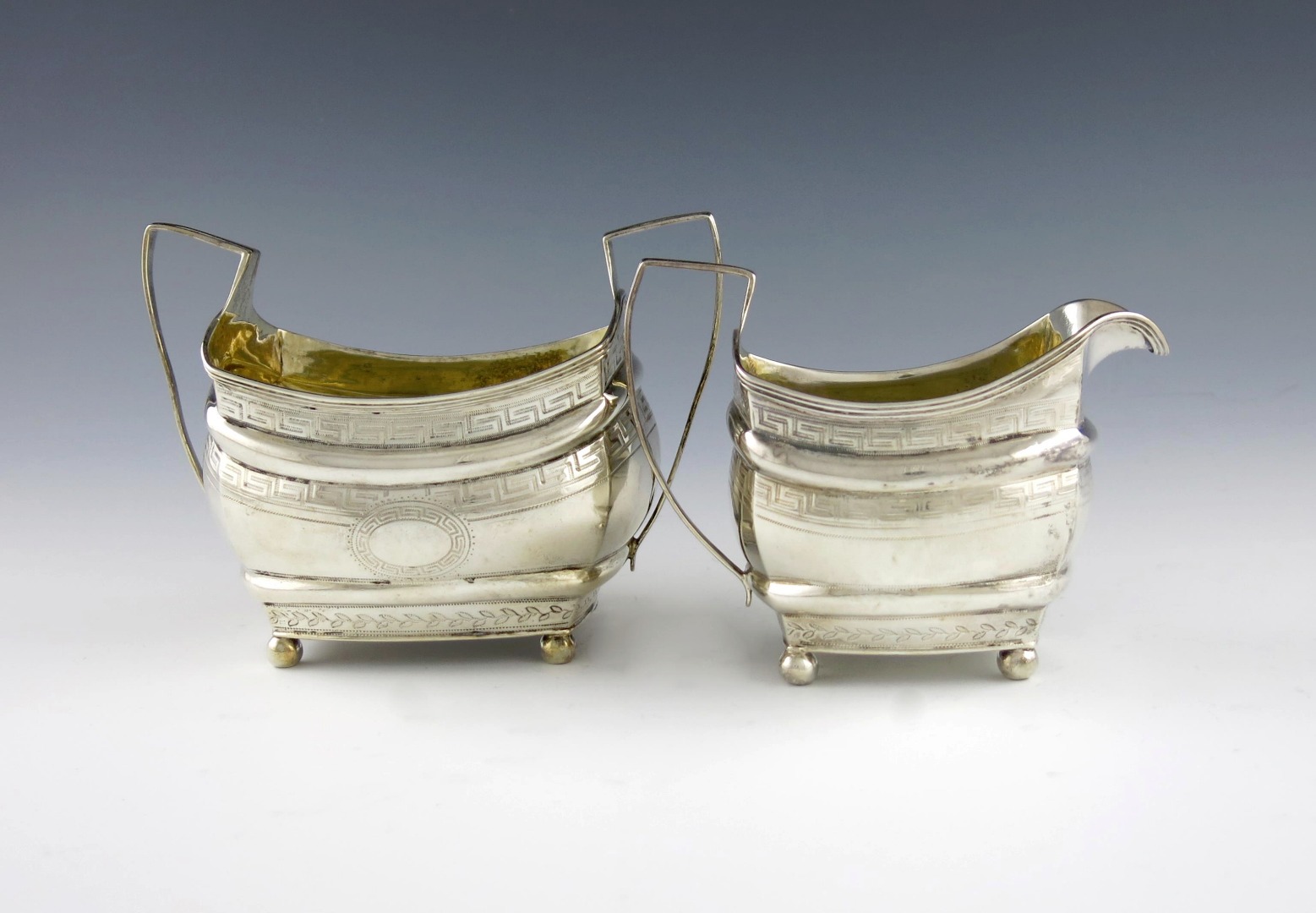 rounded rectangular form, scroll handles, Greek key borders, on four ball feet, height of cream jug 11cm, approx. weight 12.5oz. (2)