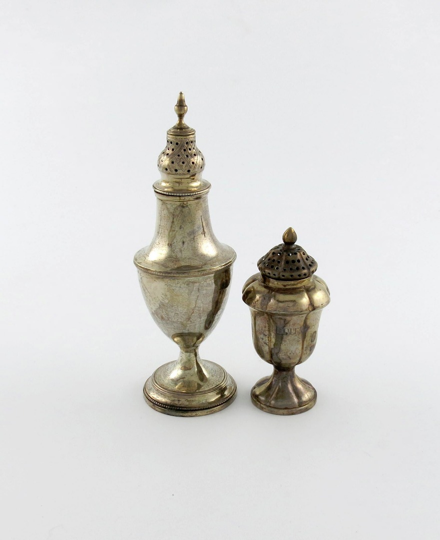 vase form, beaded borders, the cover with an acorn finial, on a raised circular foot, height 17.8cm, plus an early 19th century Indian Colonial silver pepper pot, by Hamilton and Co, Calcutta, circa 1840, lobed baluster form, engraved 'PEPPER', height 10.5cm, approx. weight 7oz. (2)