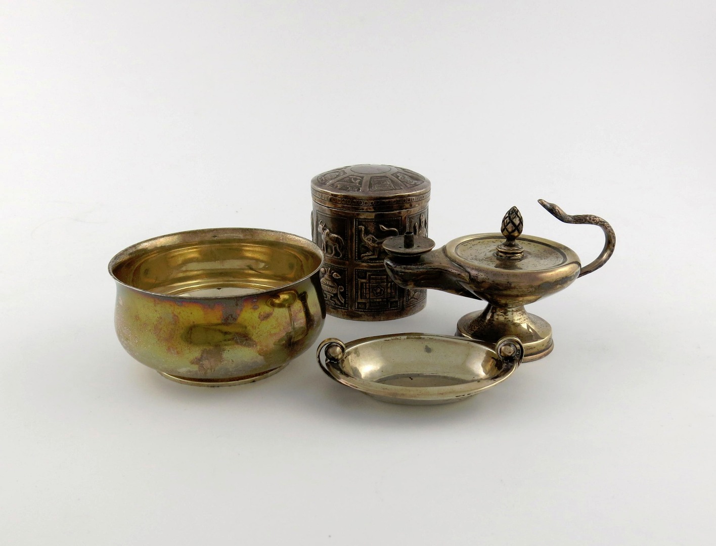 comprising: a bowl, of plain circular form, London 1921, a table cigar lighter, modelled as an oil lamp, an Indian metalware pot and cover, and an unmarked dish, approx. weight 19oz. (4)