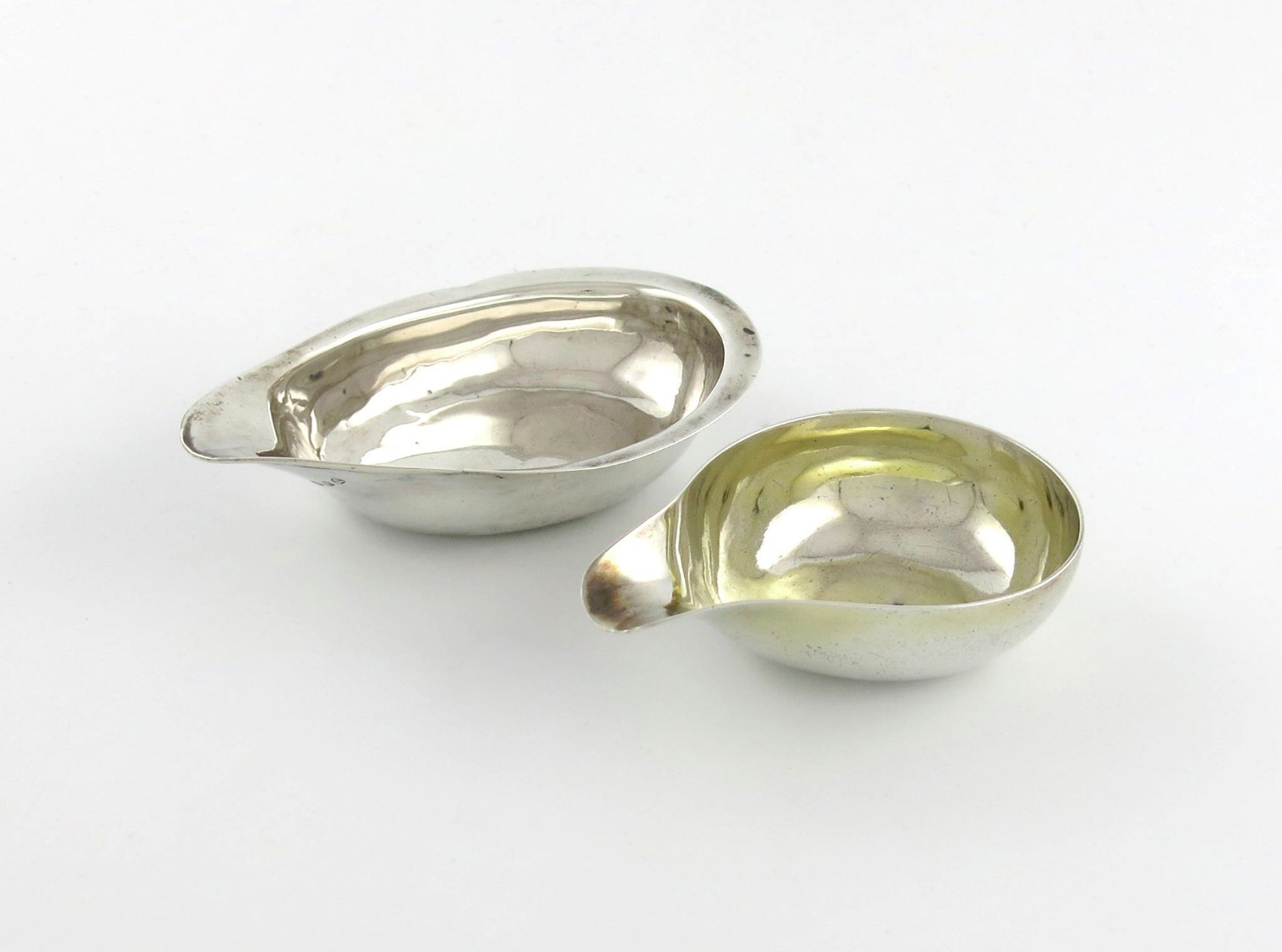 plain oval form, initialled 'D', length 13cm, plus an 18th century pap boat, marks worn, engraved with a crest and motto, plain oval form, approx. total weight 3.5oz. (2)
