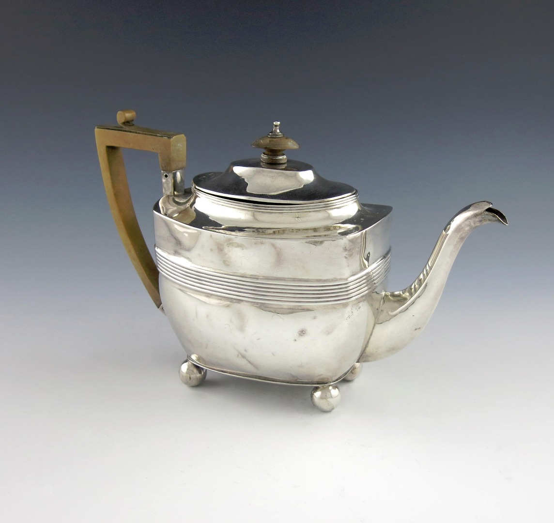 oblong form, scroll handle, flush-hinged cover, fluted girdle, on four ball feet, length 28cm, approx. weight 17.4oz.