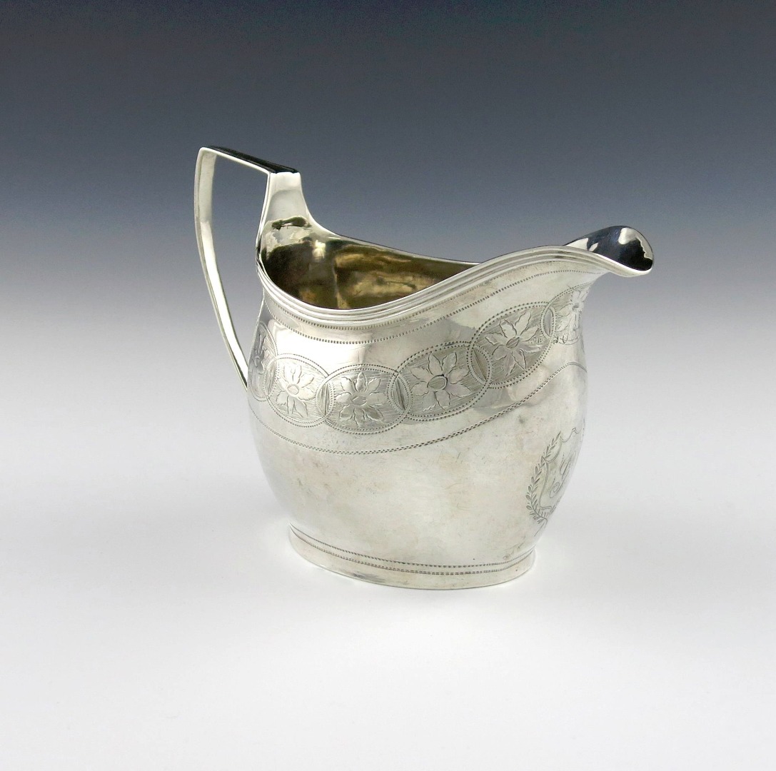 oval bellied form, engraved foliate decoration and scroll handle, height 10cm, approx. weight 3.7oz.