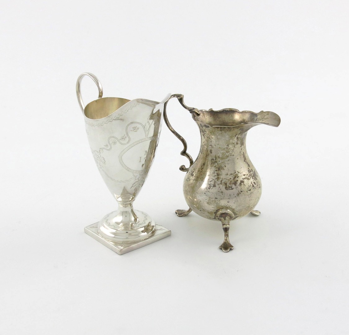 helmet form, scroll handle, engraved foliate decoration, on a raised square foot, scratch initialled, height 11.5cm, plus a George III silver cream jug, by David Mowden, London 1767, baluster form, leaf capped scroll handle, on four scroll legs, approx. total weight 4.4oz. (2)