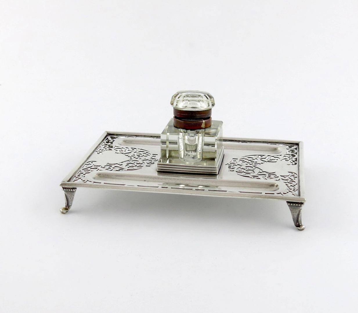 rectangular form, pierced foliate scroll decoration, with two pen wells, on four bracket feet, with a base metal mounted glass inkwell, length 19.7cm, approx. weight 10oz.
