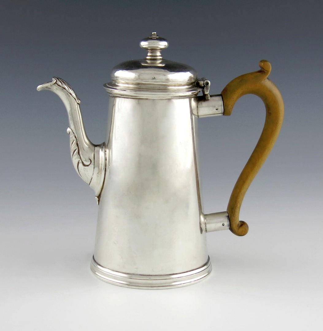 tapering circular form, scroll handle, domed hinged cover with a crest and knop finial, leaf capped spout, height 18cm, approx. weight 13.5oz.