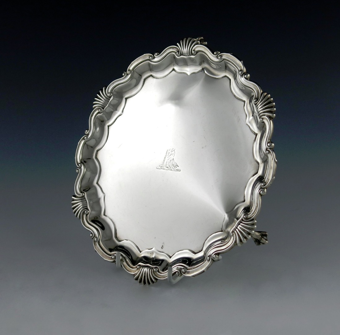 circular form, shell and scroll border, on three claw and ball feet, diameter 21.2cm, approx. weight 9.5oz.