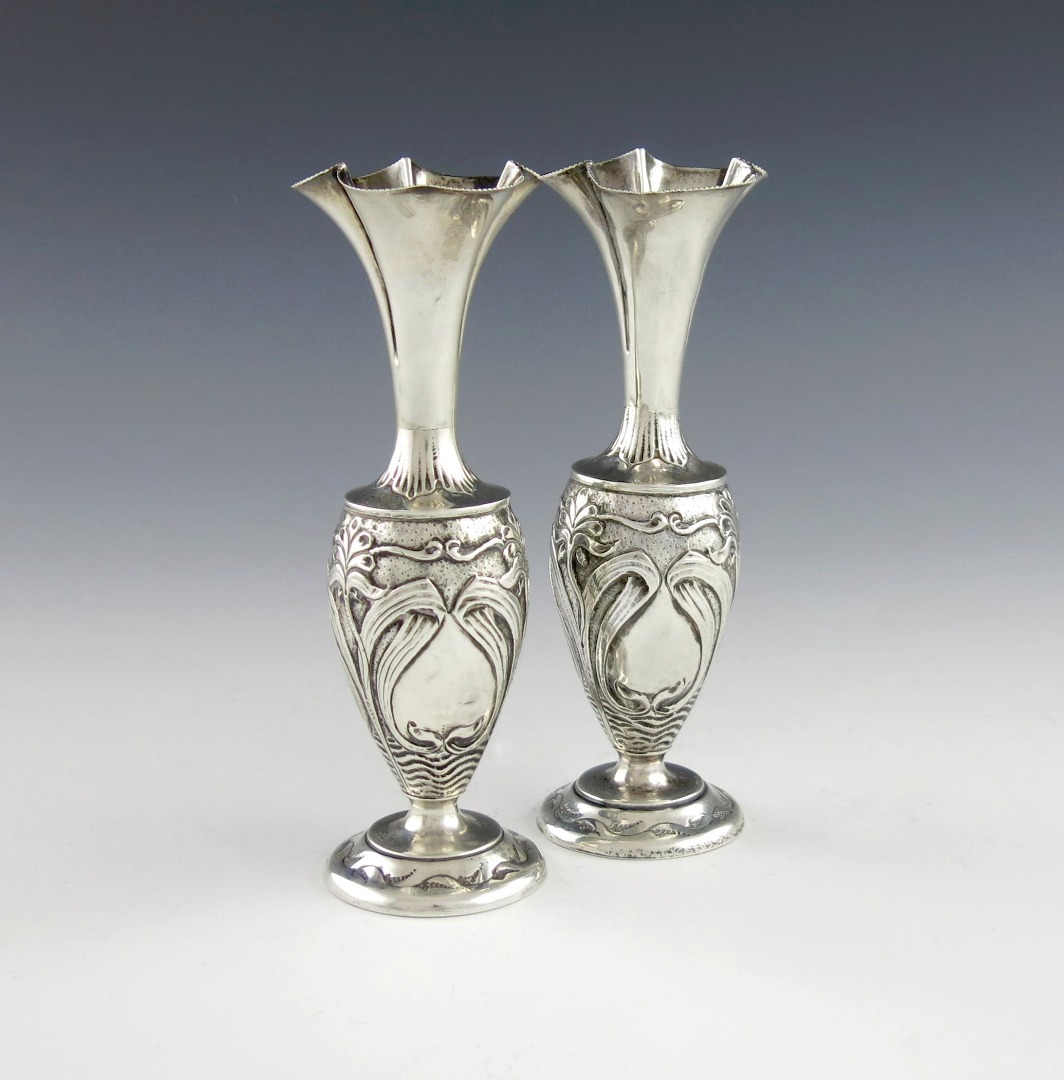 baluster form, with Art Nouveau foliate decoration, on raised circular filled bases, height 15.2cm. (2)