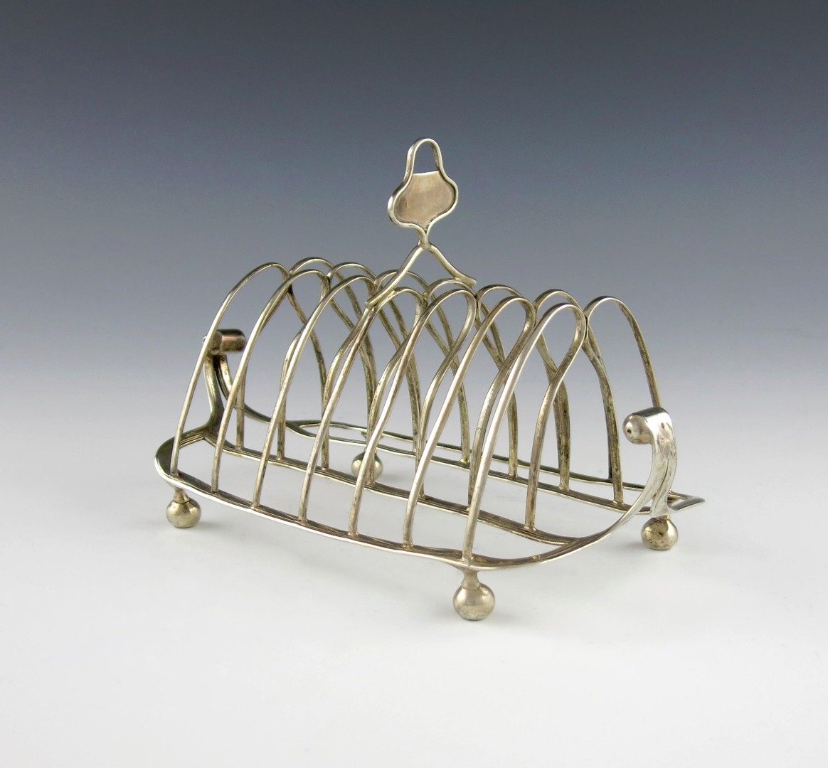 the arched bars with a central finial, on a rounded rectangular base on four ball feet, length 19.7cm, approx. weight 8.8oz.