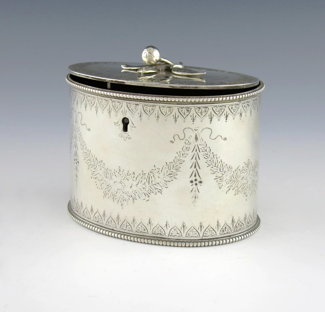 oval form, engraved with ribbon tied swags and foliate decoration, the flush hinged cover with a melon finial, beaded borders, length 12.8cm, approx. weight 12.8oz.