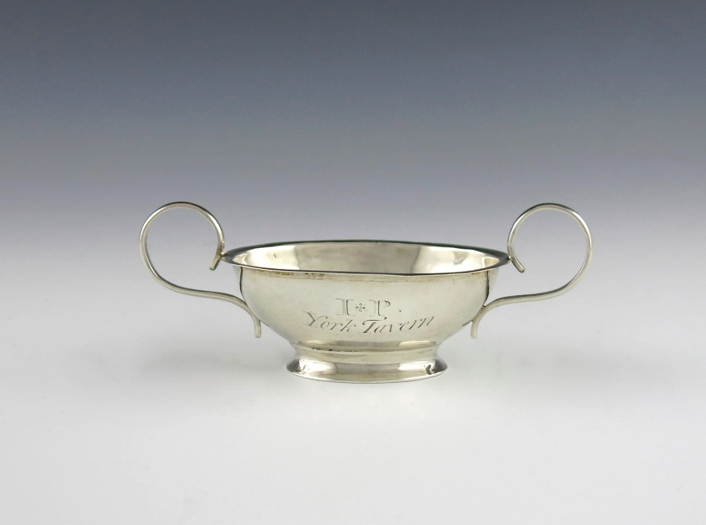 oval form, scroll handles, on a raised oval foot, inscribed 'I*P York Tavern', length handle to handle 13.5cm, approx. weight 2oz.