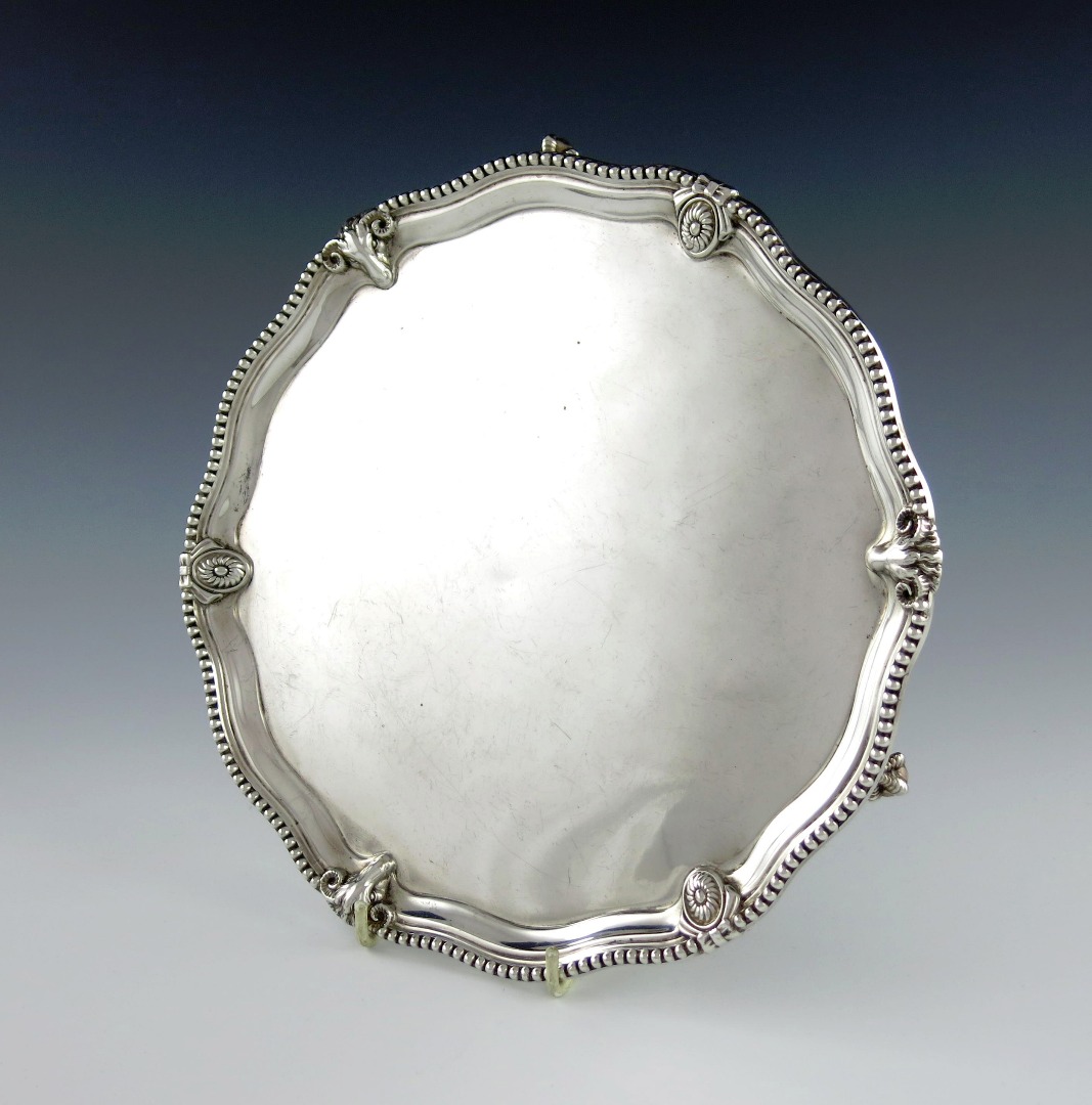 circular form, the beaded border with rams' heads and fluted medallions, diameter 26cm, approx. weight 15.5oz.