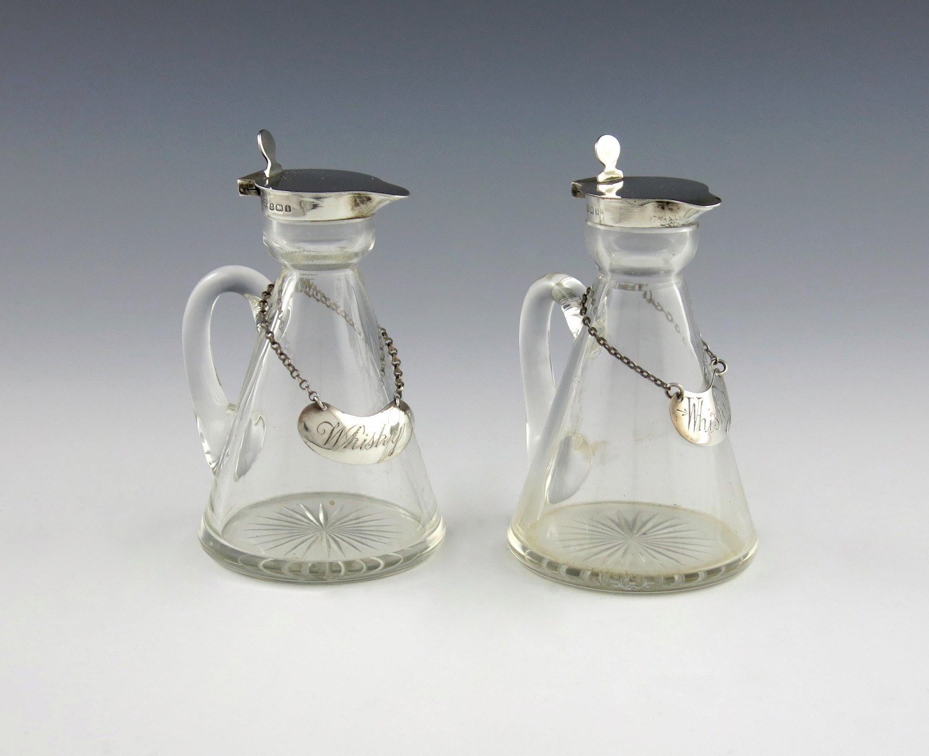 tapering conical form, plain hinged covers, scroll handles, with two whisky labels, height 11cm. (2)