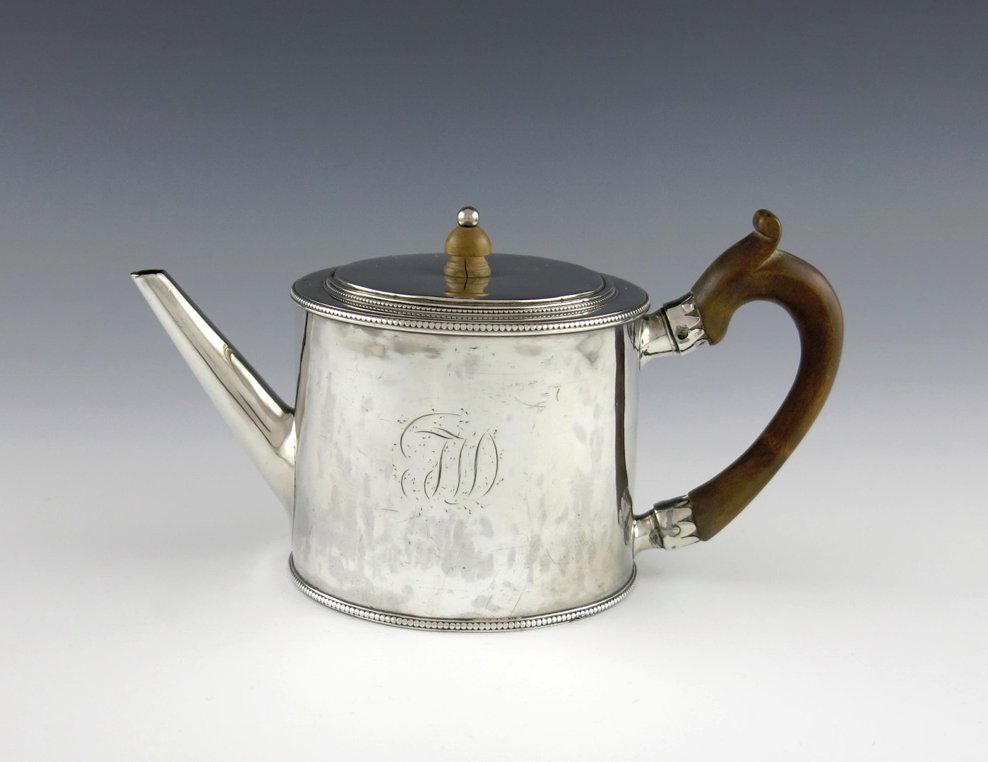 circular drum form, scroll handle, beaded borders, pull-off cover with a wooden finial, engraved with a monogram, length handle to spout 22cm, approx. weight 14.2oz.