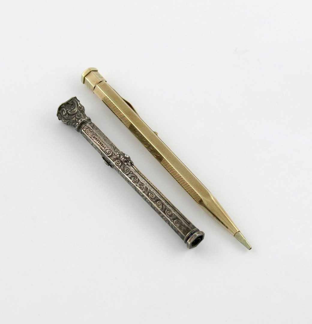 with engine turned decoration, rectangular cartouche engraved with H. E. Parker, length 12.3cm, and a silver retractable pen/pencil, marked STERLING, with foliate engraved decoration, and plain hardstone matrix, length open 12cm. (2)