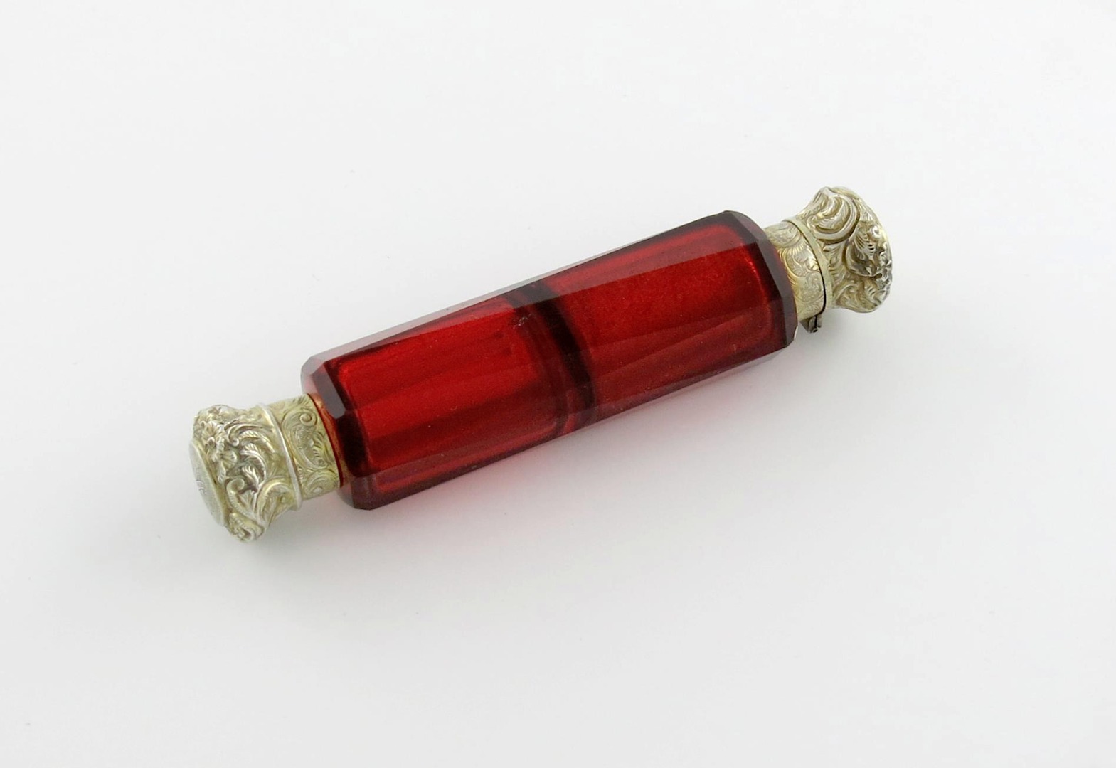 faceted red glass body, the mounts with foliate scroll decoration, initialled, length 12.5cm.