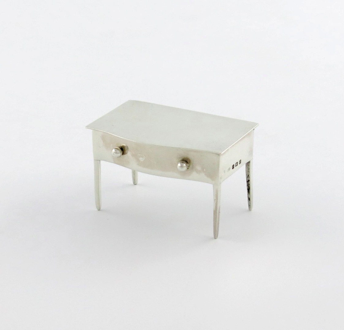 modelled as a lowboy, the hinged cover opens to reveal two compartments, the serpentine front with a dummy drawer, length 5.8cm, approx. weight 1.6oz.