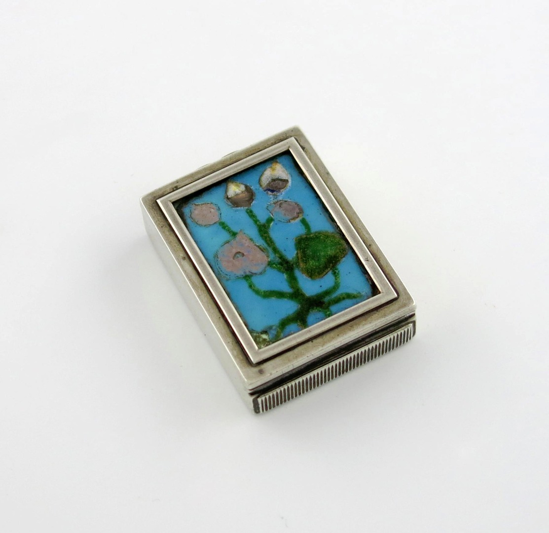 rectangular form, the hinged cover inset with an enamelled panel of flowers on a light blue ground, length 5cm, approx. weight 1.5oz.