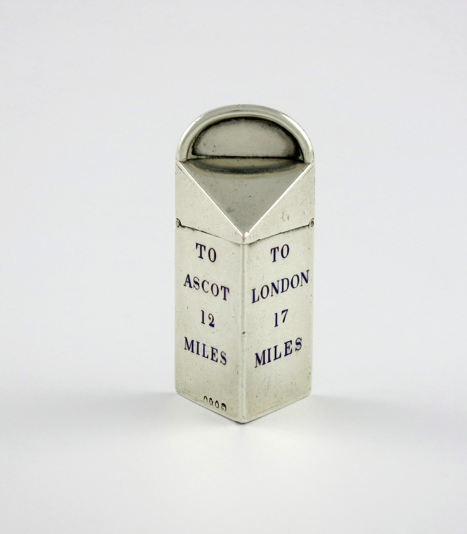modelled as a triangular mile stone, enamelled 'TO ASCOT 12 MILES' and 'TO LONDON 17 MILES', hinged cover, the base with a striker, height 6.3cm, approx. weight 1.3oz.