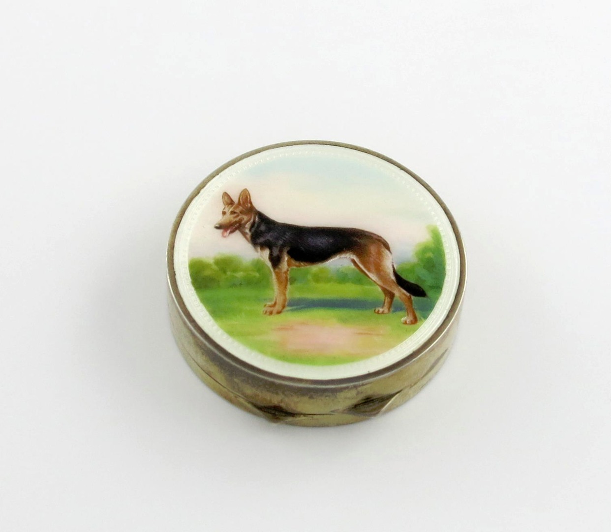 circular form, the hinged cover enamelled with a standing Alsatian dog, the interior of the cover with a mirror, diameter 5cm.