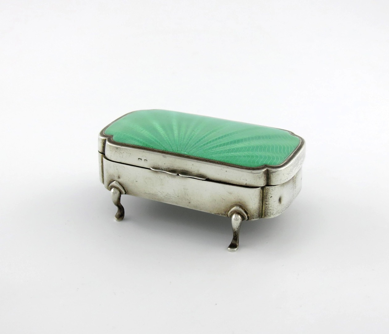 shaped rectangular form, the hinged cover with green enamel decoration, on four scroll bracket feet, length 11.8cm.