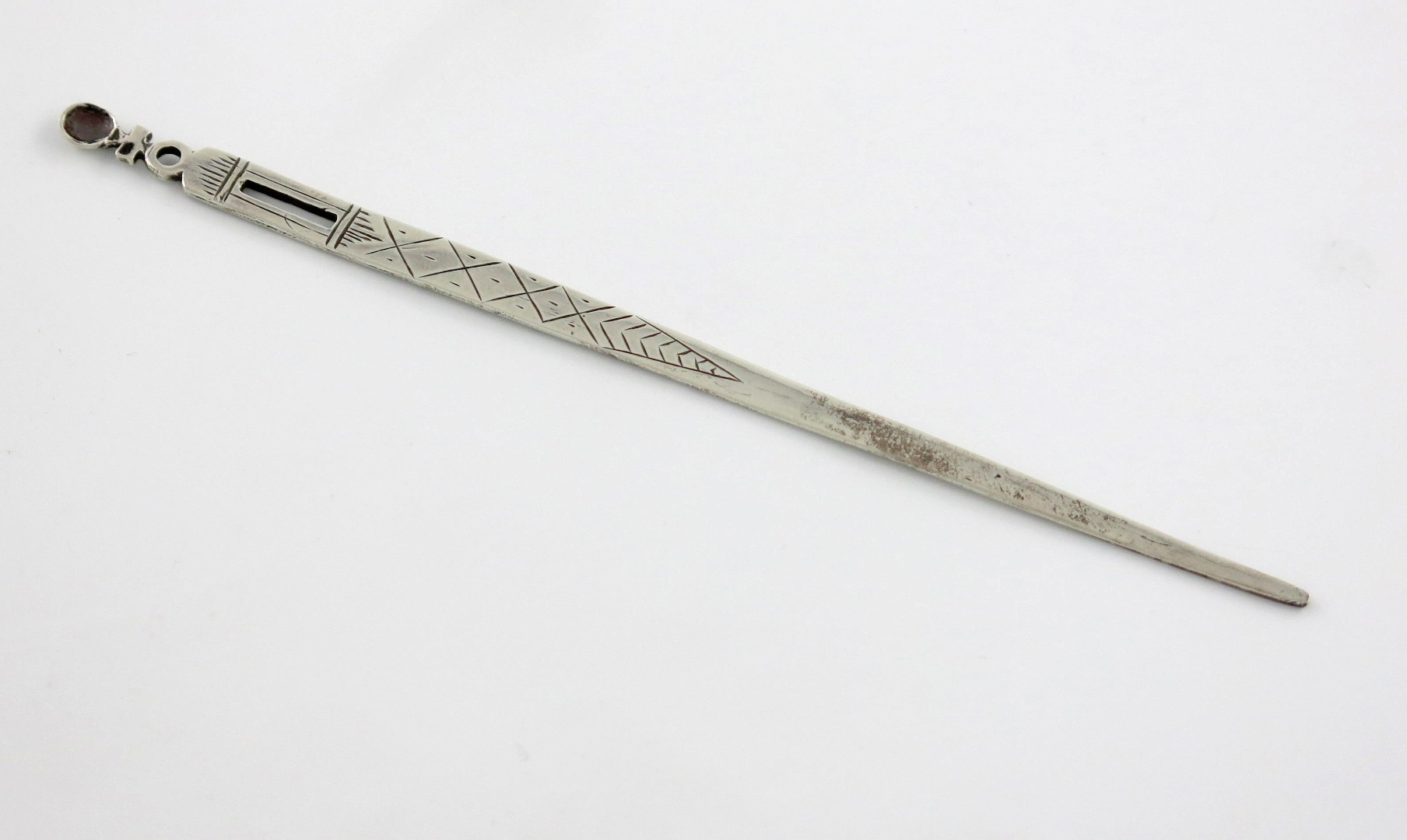 flattened tapering form, engraved decoration, with an eye and slot, and a small 'cup' spatula, scratch initialled 'LC', length 13.8cm, approx. weight 0.2oz.