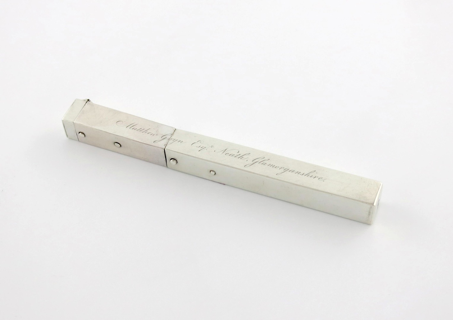 rectangular form, separating into two sections, one with a hinged cover, inscribed 'Matthew Gwyn Esq. Neath, Glamorganshire', length 18cm, approx. weight 3oz.