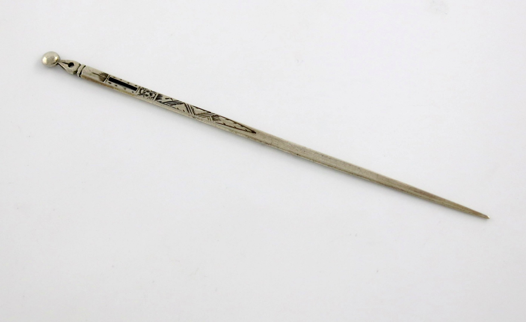 flattened tapering hexagonal form, engraved decoration, with an eye and slot, and a small 'cup' spatula, length 15cm, approx. weight 0.3oz.
