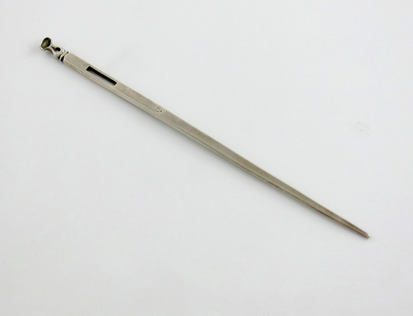 plain flattened tapering hexagonal form, with an eye and slot, and a small 'cup' spatula, length 14.6cm, approx. weight 0.4oz.