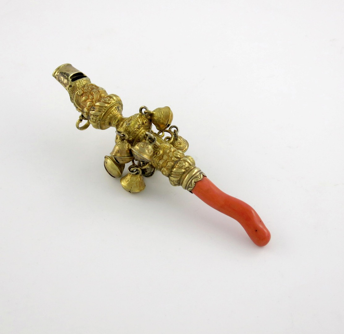 A large mid-eighteenth century silver-gilt baby's rattle and whistle