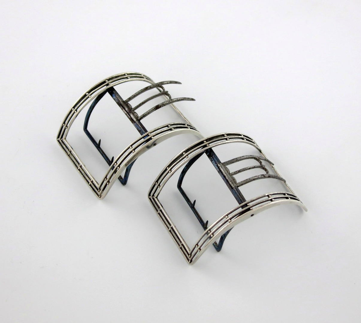shaped rectangular form, pierced gadroon borders, steel fittings, length 8.6cm. (2)