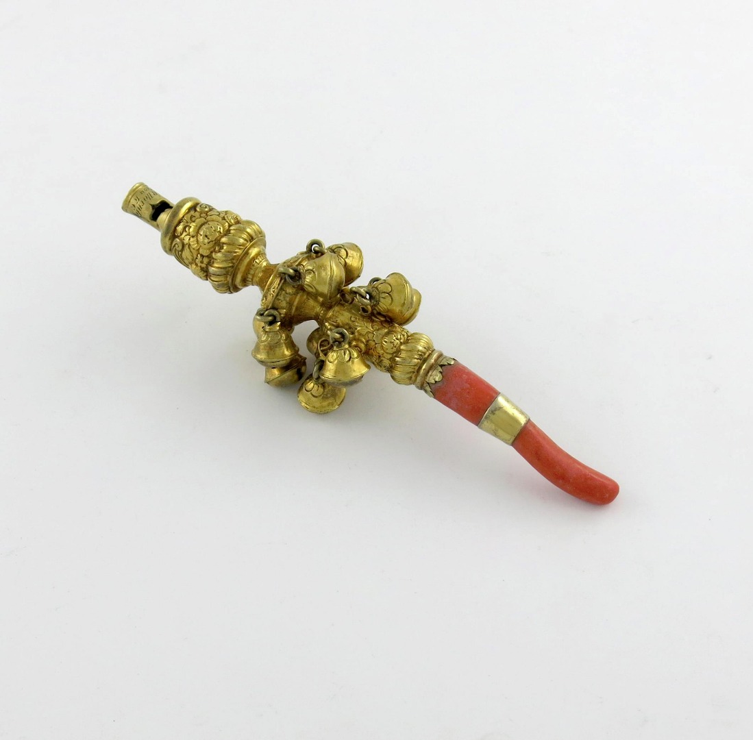 baluster form, embossed foliate decoration, with twelve hanging bells, and a coral teether, (repaired), with a loop attachment, later inscribed, length 18cm.