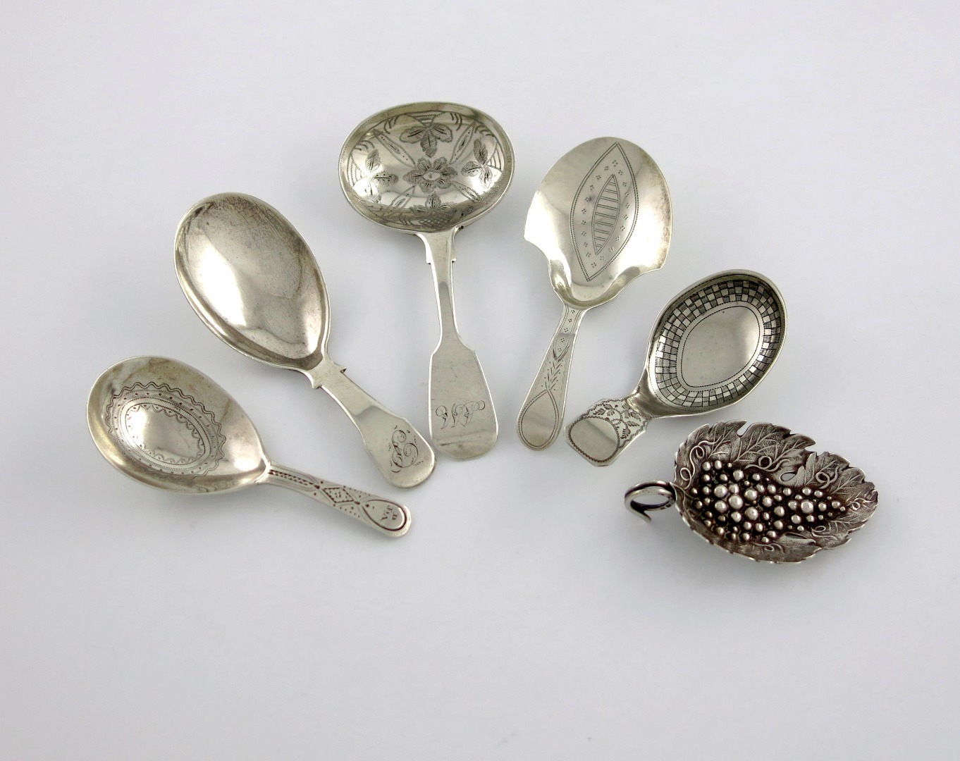 comprising a George III one, of leaf form, embossed with a bunch of grapes, by Joseph Willmore, Birmingham 1814, plus one with chequer board decoration, Birmingham 1812, two with bright-cut decoration, plus two Fiddle pattern, approx. weight 2.1oz. (6)