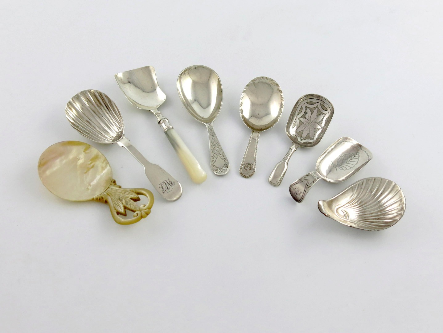 comprising: one with a feather-edge border, two with bright-cut decoration, one with a shell bowl, one with a mother-of-pearl handle, and a Victorian one with engraved decoration, plus an old Sheffield plated caddy spoon, and a mother-of-pearl caddy spoon, approx. weighable 2.1oz. (8)