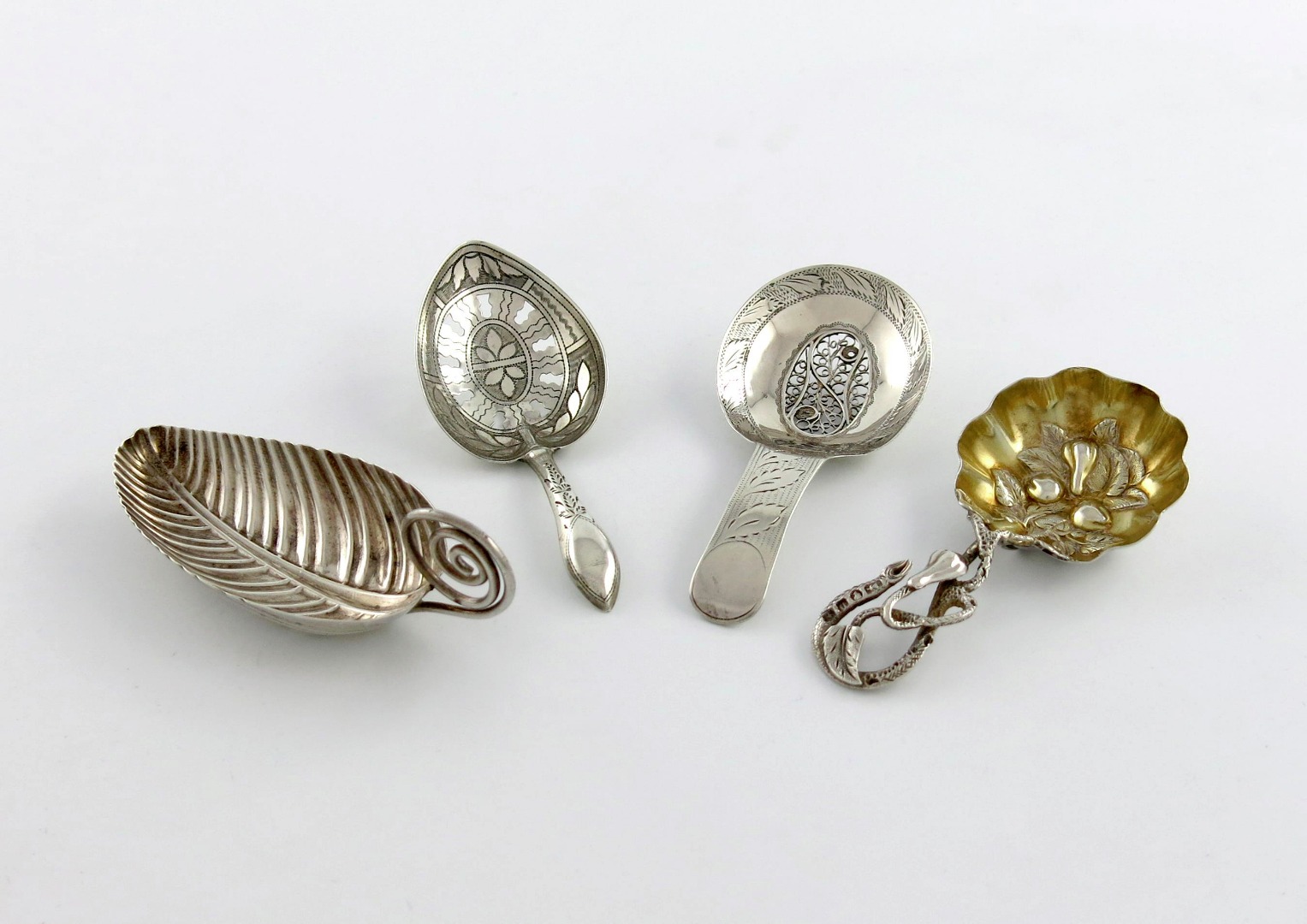 comprising: one of heart form, the bowl with pierced and engraved decoration, by Joseph Taylor, Birmingham 1814, a French caddy spoon, of fluted leaf form, a Bright-cut caddy spoon, the bowl with an oval inset of filigree decoration, and a Victorian caddy spoon, Birmingham 1852, approx. total weight 1.4oz. (4)