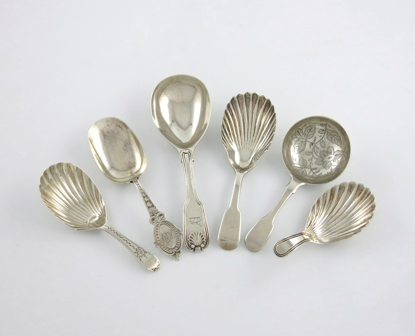 comprising: a George III Fiddle, Thread and Shell spoon, by Eley, Fearn and Chawner, London 1808, plus a Victorian caddy spoon, by George Unite, Birmingham 1875, three with shell bowls and a Fiddle pattern caddy spoon with engraved decoration, approx. weight 2.5oz. (6)