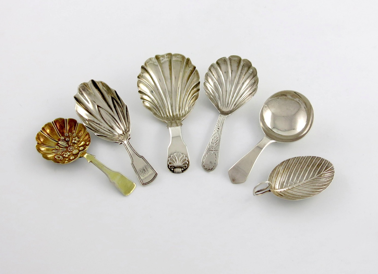 comprising: one of leaf form, Birmingham 1798, one by Josiah Snatt, London 1809, two with shell bowls, and a silver-gilt caddy spoon, Birmingham 1814, approx. weight 2.1oz. (6)