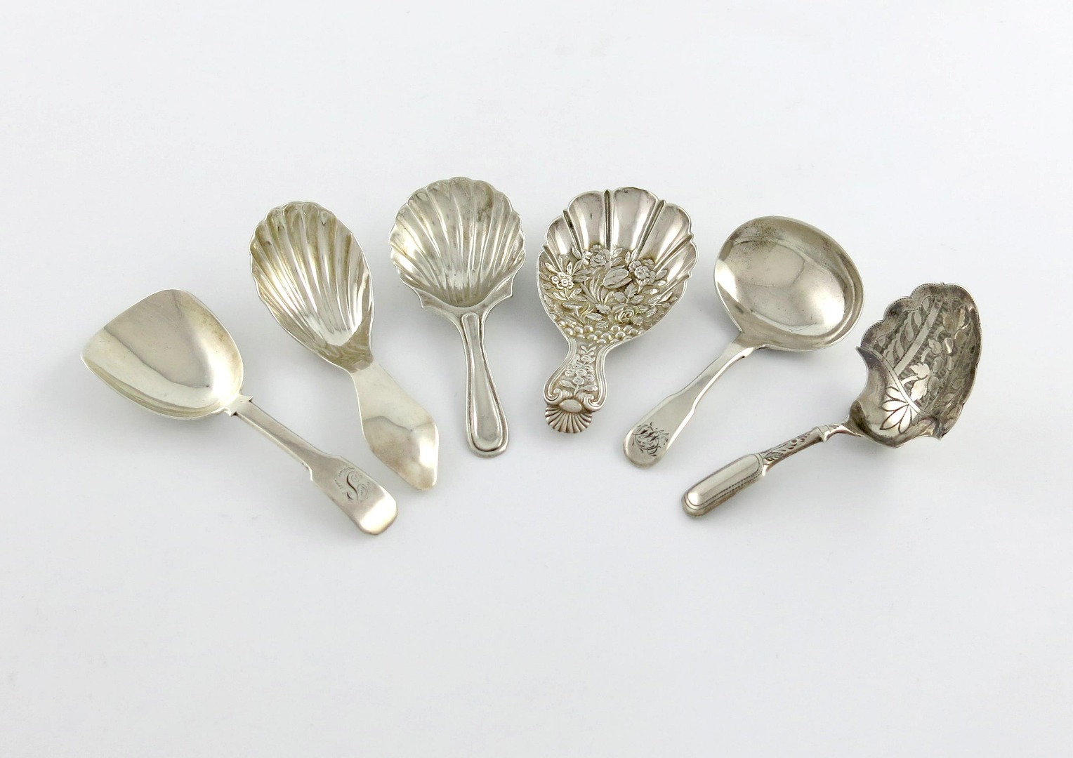 A collection of six silver caddy spoons