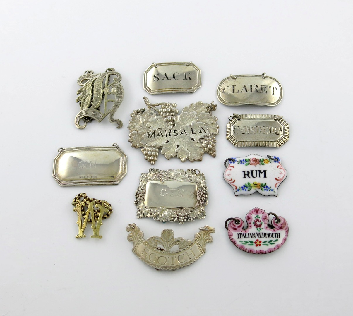 comprising silver examples: a Victorian label by Taylor and Perry, Birmingham 1840, rectangular form, canted corners, incised and blackened 'SACK', plus a Victorian Scottish silver-gilt cut-out label 'W', by Mackay and Chisolm, Edinburgh 1896, and modern Prince of Wales Feathers label, by Roberts and Belk, incised 'SCOTCH', plus a label titled 'C.MADEIRA', a label 'GIN', 'CLARET', and a modern label 'GIN', plus and electroplated label 'MARSALA', a cut-out label 'HOLLANDS', and an enamel label 'ITALIAN VERMOUTH' and one 'RUM'. (11)