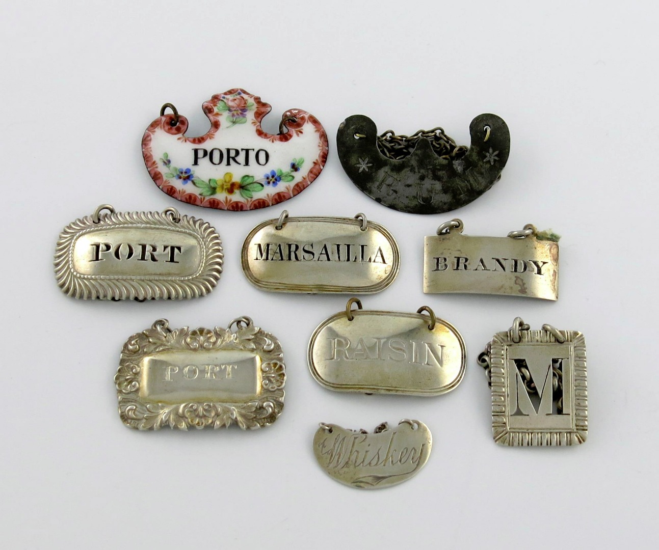 comprising silver examples: a George III label, by Phipps and Robinson, London 1800, oblong form, incised 'RAISIN', a label incised and blackened 'MARSAILLA', by John Robins, London 1804, plus a cut-out letter 'M', an early Victorian Scottish label, by John Millage, Edinburgh circa 1840, incised and blackened 'BRANDY', plus two labels pierced and incised 'PORT', a 'WHISKEY' label plus an enamel label titled 'PORTO', and a double sided lead label incised 'RUM'. (9)