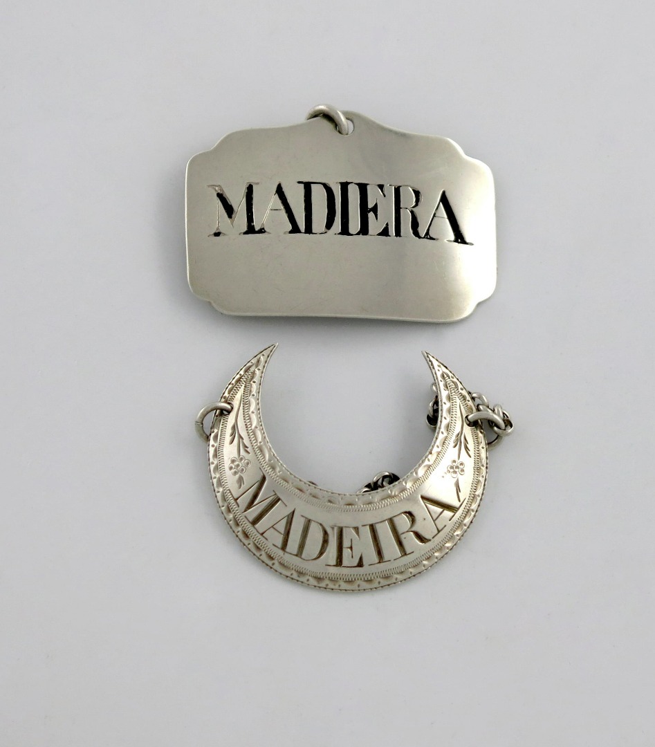 crescent form, bright-cut decoration, incised 'MADEIRA', length 4cm, plus an 18th century unmarked wine label, of rectangular form, incurved corners, blackened 'MADIERA', length 4.8cm. (2)