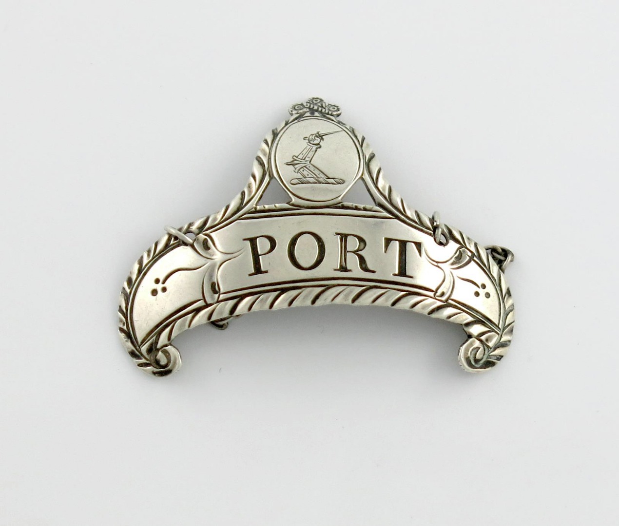 scroll form with a raised pediment with a crest, feather edge border, incised 'PORT', length 4.8cm