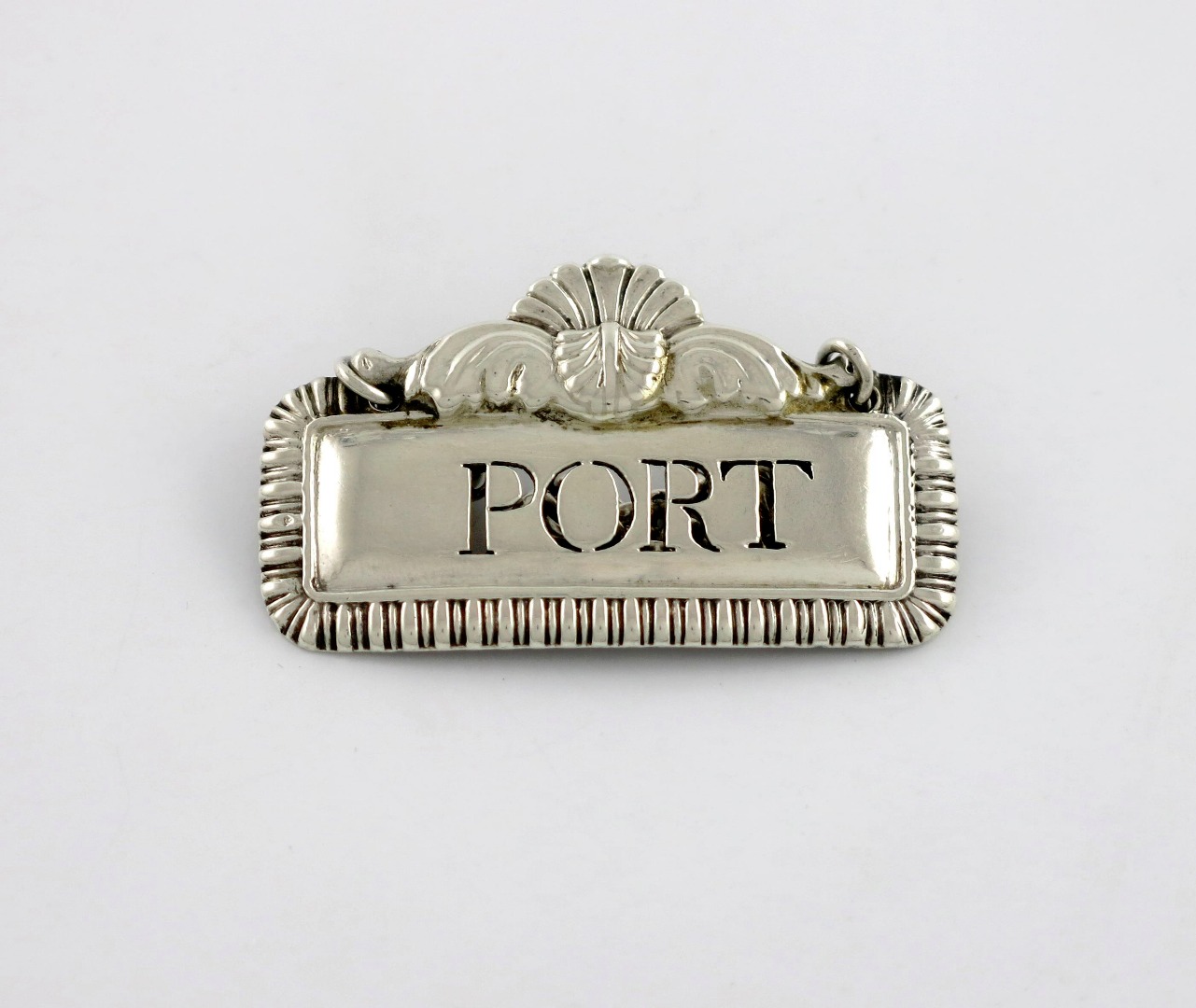 rectangular form, gadroon border, scroll and shell pediment, pierced 'PORT', length 5.5cm, approx. weight 0.8oz.