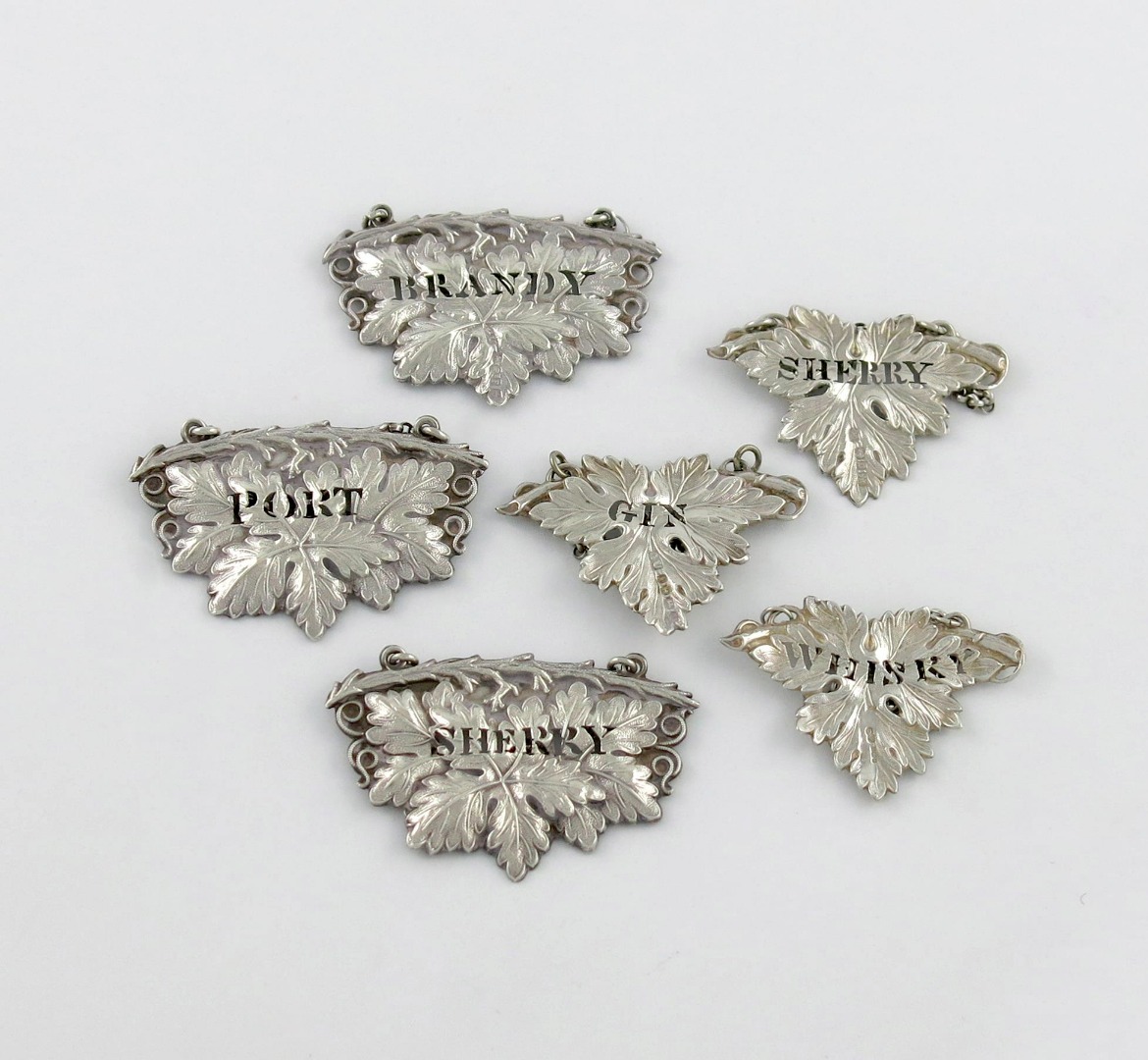 comprising: two by George Unite, Birmingham 1868 and 1890, pierced 'GIN' and 'SHERRY', plus a similar by Deakin and Francis, Birmingham 1975, pierced 'WHISKY', and a matched set of three by George Unite, Birmingham 1836 and 1854, pierced 'PORT', 'SHERRY' and 'BRANDY', approx. total weight 2oz. (6)