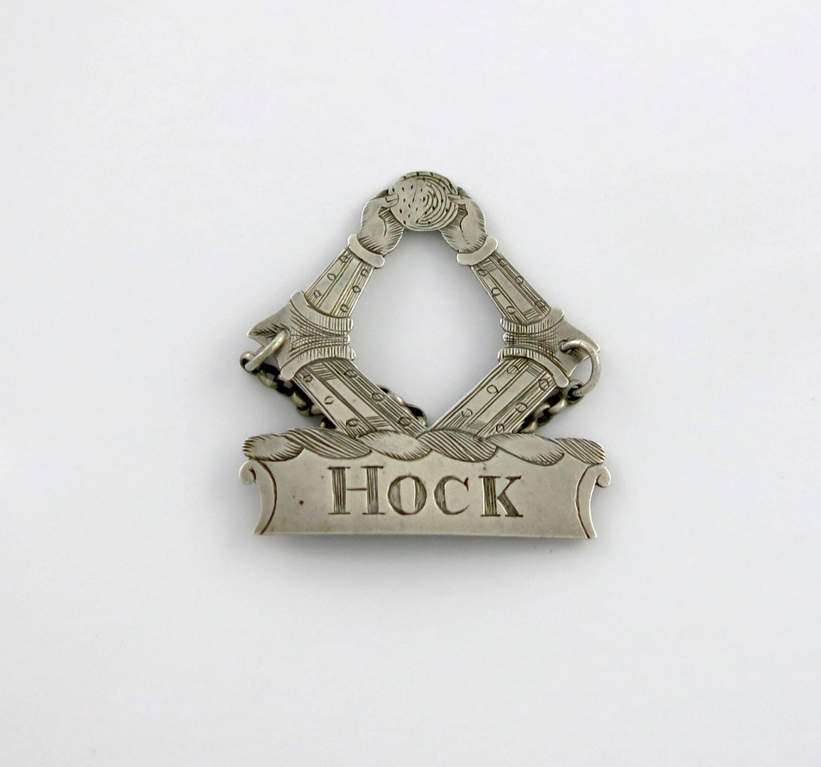 modelled as two armoured arms holding a disc, incised 'HOCK', height 4.6cm, approx. weight 0.2oz.