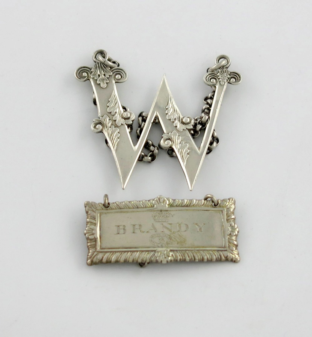 rectangular form, gadroon border, engraved with the royal crown and garter ribbon, incised 'BRANDY', length 4.8cm, plus a George IV Scottish silver 'cut-out' letter label, by George Horton, Birmingham 1828, modelled as a 'W', with foliate decoration. (2)