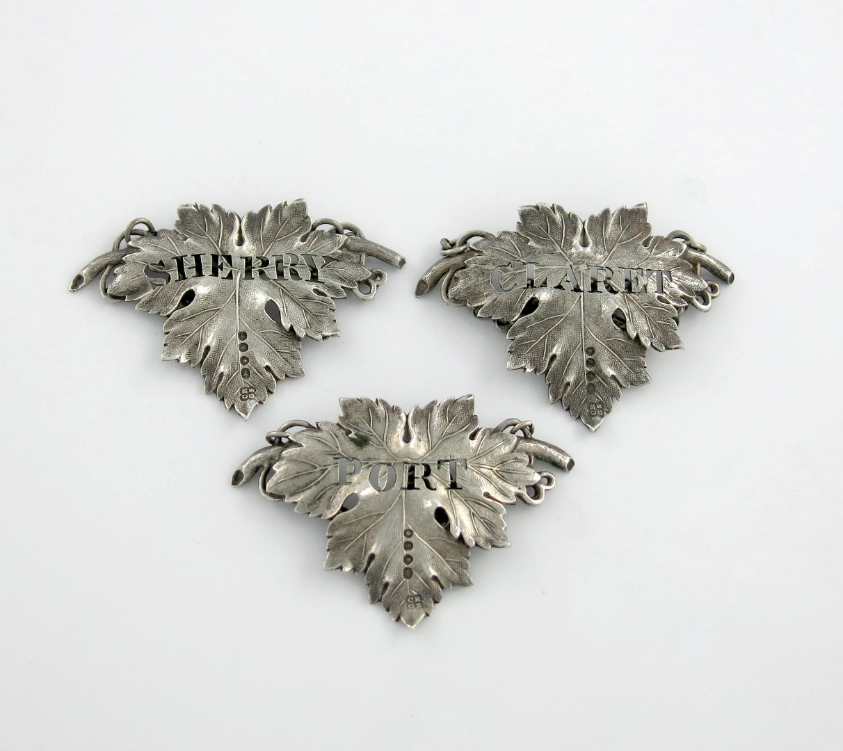 vine leaf form, pierced 'SHERRY', 'CLARET' and 'PORT', length 6.8cm. (3)