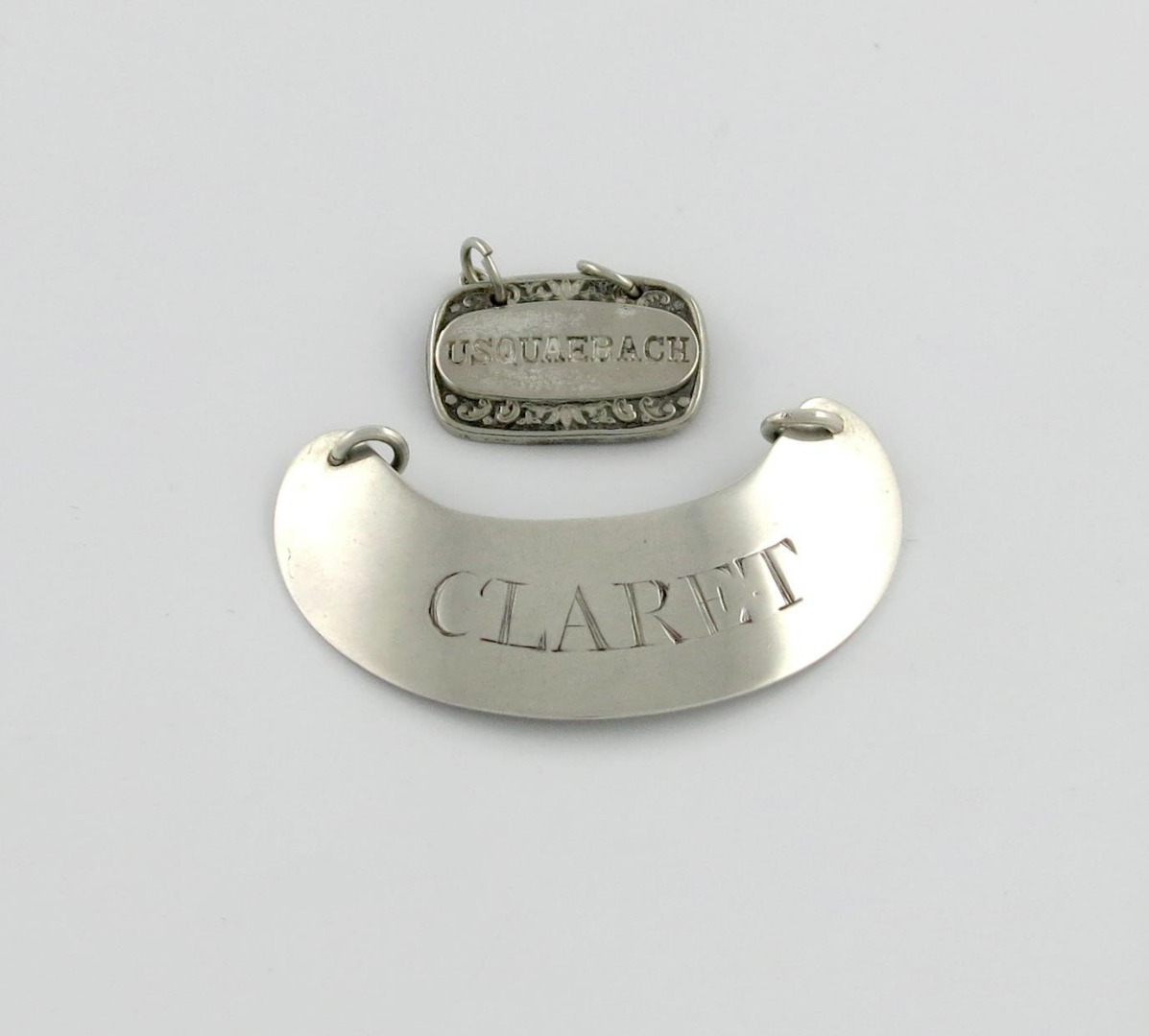 plain kidney form, incised 'CLARET', scratch initialled 'A.S', length 5.5cm, plus an unusual electroplated label, of rectangular form, titled 'USQUAEBACH', length 2.5cm. (2)