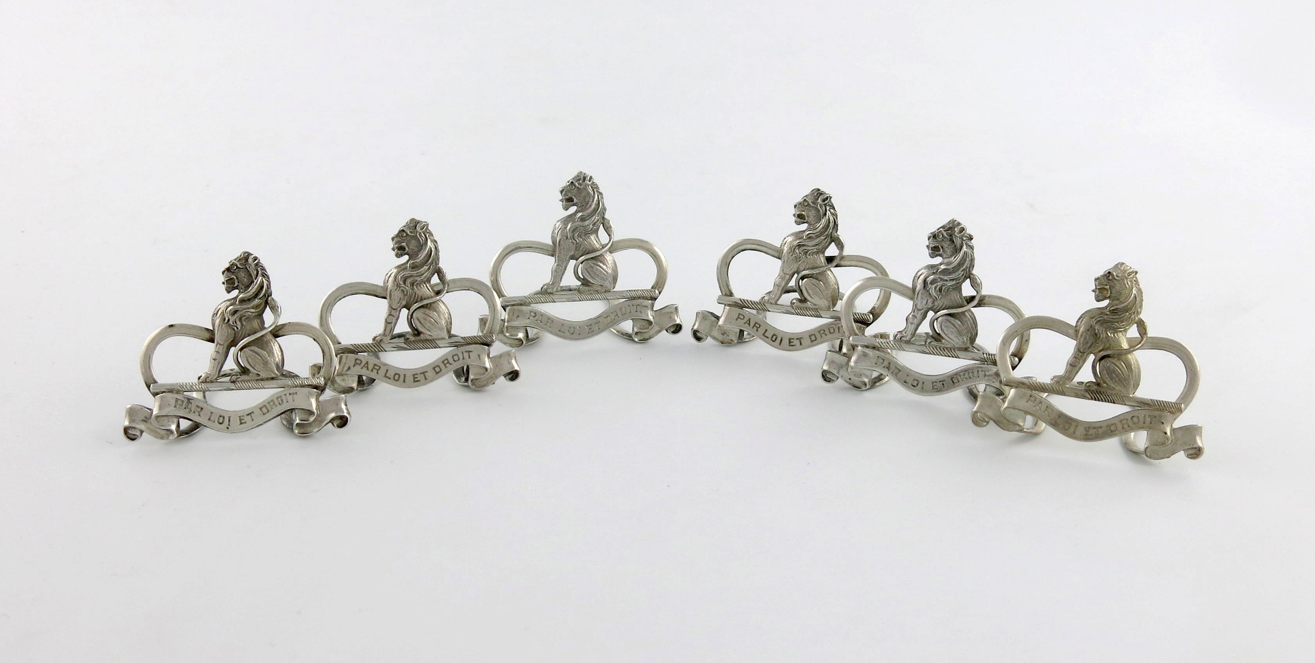 modelled as a seated lion with a motto, height 4.4cm, approx. weight 6oz. (6)