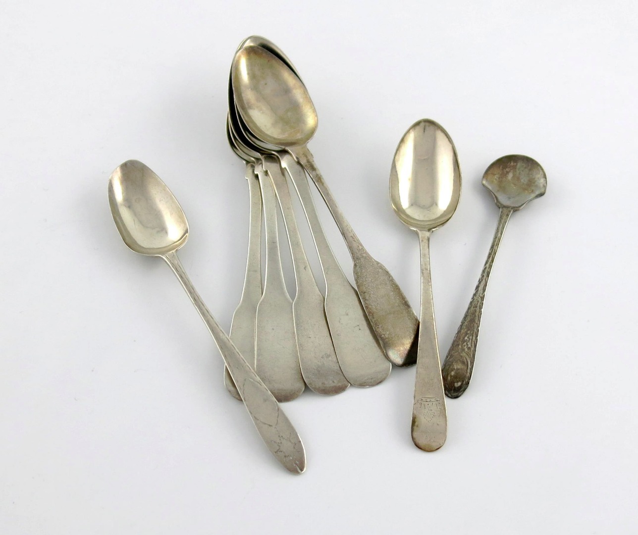including: a set of four Fiddle pattern teaspoons, by Terry and Williams, circa 1800, a Bright-cut Star pattern teaspoon by John Warner, circa 1790, a salt spoon by Carden Terry, a teaspoon by Joseph Gibson and one by Isaac Solomon, approx. weight 3.5oz. (8)